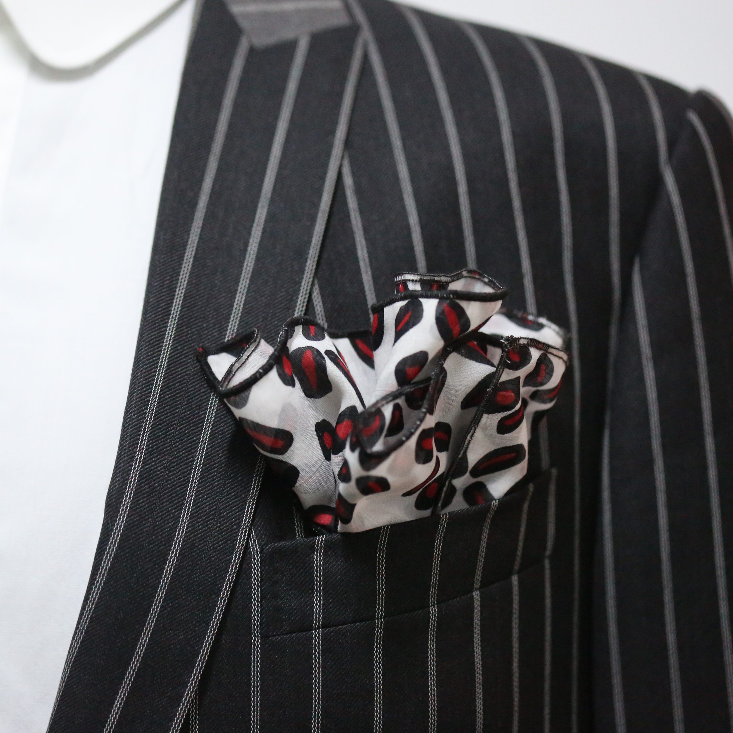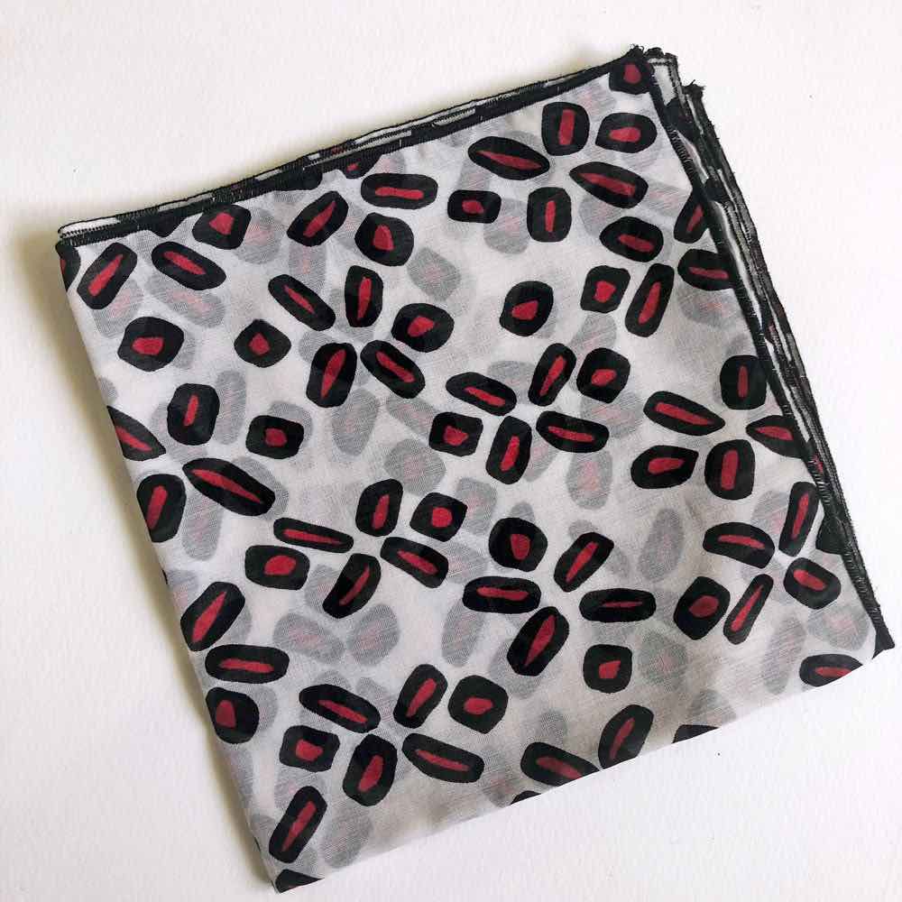 Lenço de Bolso LLPocket em cores Brancas, com apontamentos quadrados Vermelhos e Pretos que fazem lembrar os grãos de café. Ideal para fatos cinzentos e pretos.